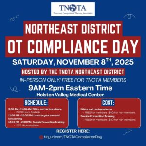 About This Course: TNOTA's OT Compliance Day is an opportunity for OTs and OTAs to take continuing education courses required for their licensure. OTs and OTAs are required to have 2 hours of Ethics & Jurisprudence coursework each licensure cycle (every 2 years). OTs are required to have 2 hours of suicide prevention training every 2 licensure cycles (every 4 years). Due to the nature of suicide prevention, the event will not be live streamed or recorded. Attendees can register for E & J, suicide prevention, or both. This event is open to any OT practitioner (TNOTA members and non-members).